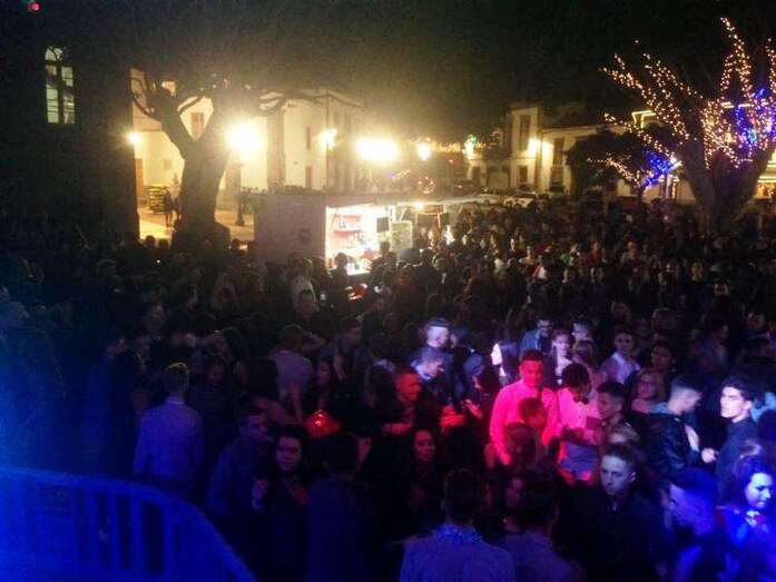 La jarana comenzó con poca gente a filo de las 22.00 horas, pero luego se fue animando con la concurrencia de personas, en su mayoría jóvenes que quisieron partir el año bailando y disfrutando en la plaza del casco histórico de la ciudad, en un evento que fue posible gracias a la ayuda de firmas comerciales que instalaron varios chiringuitos.