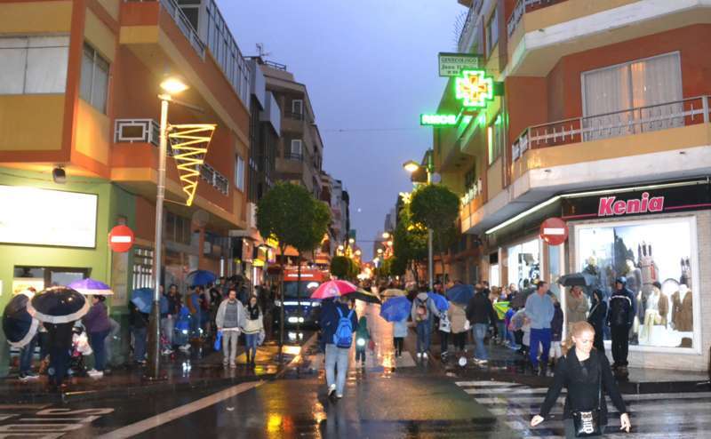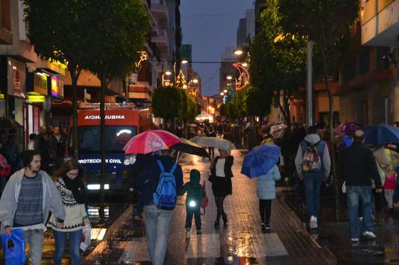Pero Telde no es el único municipio que se ha visto afectado por las lluvias. Así, una tromba de agua también jarreaba sobre Las Palmas de Gran Canaria alrededor de las 17.00, justo cuando arrancaba el desfile real.
