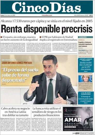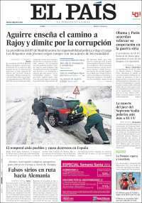 El País: "Aguirre enseña el camino a Rajoy y dimite por la corrupción"; "Obama y Putin acuerdan reforzar su cooperación en la guerra siria"; "La muerte del juez del Supremo Scalia polariza aún más a EE UU"; "Falsos sirios en ruta hacia Alemania"; "El temporal aísla pueblos y causa destrozos en España".