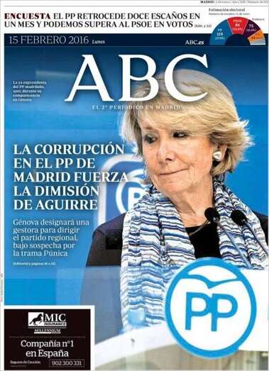 ABC: "La corrupción en el PP fuerza la dimisión de Aguirre: Génova designará una gestora para dirigir el partido regional, bajo la sospecha de la trama Púnica".