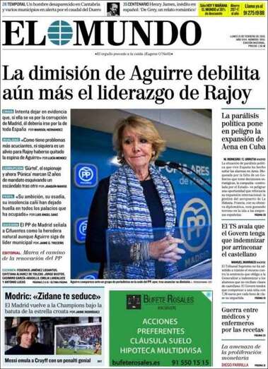 El Mundo: "La dimisión de Aguirre debilita aún más el liderazgo de Rajoy", "La parálisis política pone en peligro la expansión de Aena en Cuba", "El TS avala que el Govern tenga que indemnizar por arrinconar el castellano", "Modric: "Zidane te seduce".