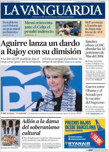 La Vanguardia: "Aguirre lanza un dardo a Rajoy con su dimisión", "Adiós a la dama del soberanismo cultural", "Sánchez ofrece a CDC abordar las 23 peticiones de Mas del 2014", "Guerra entre Obama y el Senado por la vacante del Supremo".
