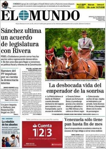 El Mundo: "Sánchez ultima un acuerdo de legislatura con Rivera"; "La desbocada vida del emperador de la sonrisa. La Policía detiene al dueño de Vitaldent cuando planeaba deshacerse del negocio para esquivar a sus franquiciados, que le acusan de estafarles"; "Venezuela sólo tiene pan hasta fin de mes"; "Barones del PP impulsan por su cuenta la democracia interna"; "Un juez imputa a Sarkozy por financiación ilegal en 2012".