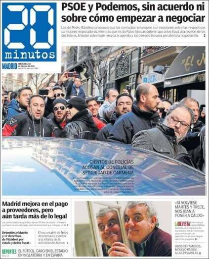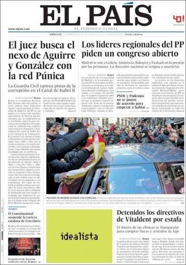 El País: "El juez busca el nexo de Aguirre y González con la red Púnica"; "Los líderes regionales del PP piden un congreso abierto. PSOE y Podemos no se ponen de acuerdo para empezar a hablar"; "Policías de Madrid acosan a su concejal"; "Detenidos los directivos de Vitaldent por estafa"; "El Constitucional suspende la cartera catalana de Exteriores".