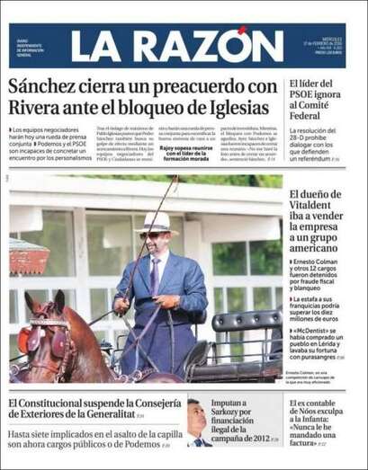 La Razón: "Sánchez cierra un preacuerdo con Rivera ante el bloqueo de Iglesias. Rajoy sopesa reunirse con el líder de la formación morada"; "El líder del PSOE ignora al Comité Federal"; "El dueño de Vitaldent iba a vender la empresa a un grupo americano"; "El Constitucional suspende la