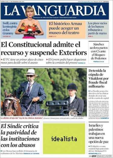 La Vanguardia: "Sánchez acelera pactos con C's ante el bloqueo de Podemos"; "El TC suspende las funciones de la Conselleria d'Exteriors"; "Detenida la cúpula de Vitaldent por fraude fiscal millonario"; "El Síndic critica la pasividad de las instituciones con los abusos"; "Israelíes y palestinos trabajan en una nueva opción de paz".