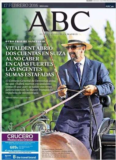 ABC: "Vitaldent abrió dos cuentas en Suiza al no caber en cajas fuertes las ingentes sumas estafadas. El Consejo General de Dentistas avisa de que "habrá nuevos escándalos" como el que ayer se saldó con trece detenciones en la mayor franquicia española de odontología".