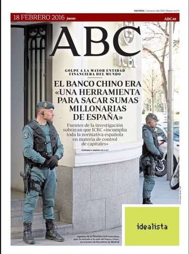 ABC: "Golpe a la mayor entidad financiera del mundo. El banco chino era "una herramienta para sacar sumas millonarias de España". Fuentes de la investigación subrayan que ICBC "incumplía toda la normativa española en materia de control de capitales"".