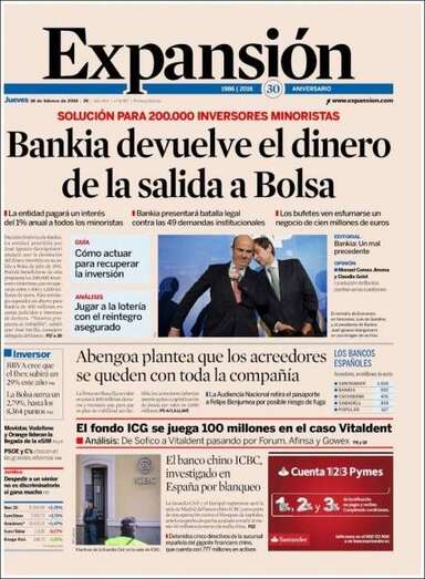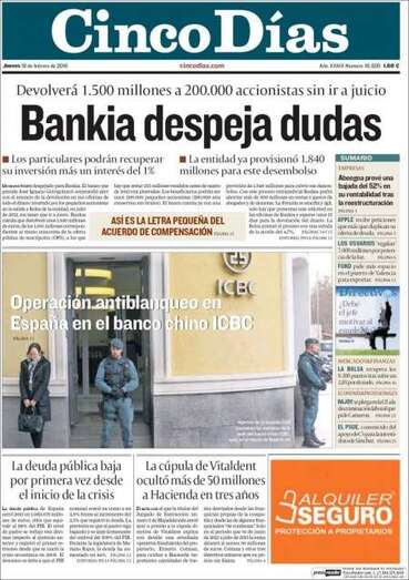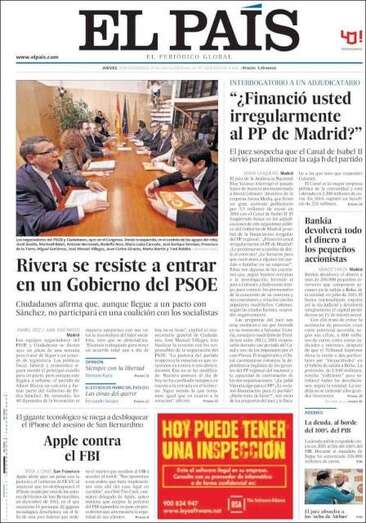 El País: "Rivera se resiste a entrar en un Gobierno del PSOE"; "Interrogatorio a un adjudicatario. "¿Financió usted irregularmente al PP de Madrid?". El juez sospecha que el Canal de Isabel II sirvió para alimentar la caja b del partido"; "Apple contra el FBI. El gigante tecnológico se niega a desbloquear el iPhone del asesino de San Bernardino"; "Bankia devolverá todo el dinero a los pequeños accionistas".