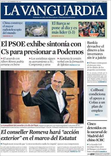 La Vanguardia: "El PSOE exhibe sintonía con C's para presionar a Podemos"; "El conseller Romeva hará "acción exterior" en el marco del Estatut"; "Bankia devuelve el dinero a los inversores sin ir a juicio"; "Collboni condiciona el apoyo a Colau a un plan de empleo"; "Cinco detenidos en la sucursal de Madrid del chino ICBC".