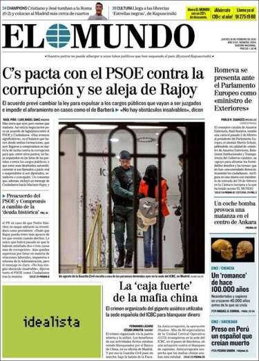 El Mundo: "C's pacta con el PSOE contra la corrupción y se aleja de Rajoy. Preacuerdo del PSOE y Compromís a cambio de la 'deuda histórica'"; "La 'caja fuerte' de la mafia china. El crimen organizado del gigante asiático utilizaba la sede española del ICBC para blanquear dinero"; "Romeva se presenta ante el Parlamento Europeo como "ministro de Exteriores""; "Un coche bomba provoca una matanza en el centro de Ankara".