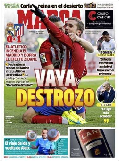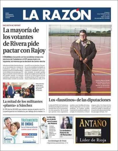 La Razón: "La mayoría de los votantes de Rivera pide pactar con Rajoy"; "La mitad de los militantes *planta* a Sánchez"; "Los 'faustinos' de las diputaciones"; "La derrota en el derbi saca lo peor del Madrid"; "La verdadera historia de 'El renacido'".
