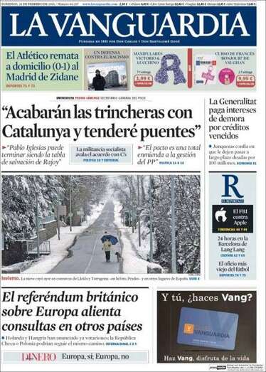 La Vanguardia: "'Acabarán las trincheras con Catalunya y tenderé puentes'. Entrevista a Pedro Sánchez, secretario general del PSOE"; "La militancia socialista avala el acuerdo con C's"; "La Generalitat paga intereses de demora por créditos vencidos"; "El referéndum británico sobre Europa alienta consultas en otros países"; "El Atlético remata a domicilio (0-1) al Madrid de Zidane"; "24 horas en la Barcelona de Lang Lang"; "El oficio más viejo del fútbol".