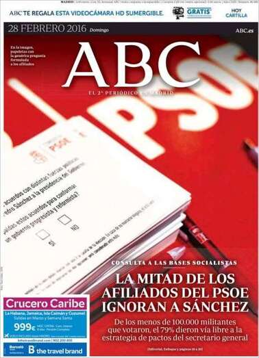 ABC: "La mitad de los afiliados del PSOE ignoran a Sánchez"; "Rivera insistirá en la investidura en que su pacto con el PSOE no es anti-PP"; "El alto el fuego se mantiene en Siria pese a algunos ataques de Daesh"; "La salida del Reino Unido de la UE supondría la pérdida de 100.000 empleos en la City"; "El segundo temporal del invierno deja media España cubierta de nieve"; "El Atlético hurga en la herida del Madrid de Zidane"; "Scott Kelly: 'Podría quedarme aquí otro año'. Vuelve a la Tierra tras un año en la EEI".