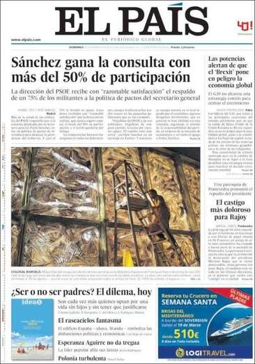 El País: "Sánchez gana la consulta con más del 50% de participación"; "Las potencias alertan de que el 'Brexit' pone en peligro la economía global"; "El castigo más doloroso para Rajoy"; "¿Ser o no ser padres? El dilema, hoy"; "El rascacielos fantasma"; "Esperanza Aguirre no da tregua"; "Polonia turbulenta".