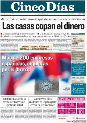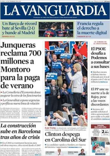 La Vanguardia: "Junqueras reclama 700 millones a Montoro para la paga de verano: la Conselleria d'Economia desea asegurar la extra de los funcionarios"; "La construcción sube en Barcelona tras años de crisis"; "Clinton despega en Carolina del Sur: la candidata vapulea a Sanders, en vísperas del decisivo 'supermartes'"; "Francia regula el derecho a la muerte digital".
