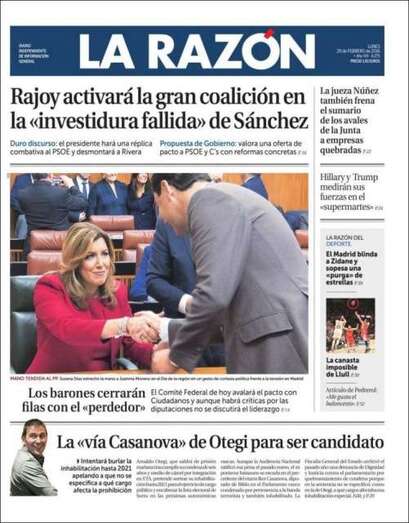 La Razón: "Rajoy activará la gran coalición en la "investidura fallida" de Sánchez"; "Los barones cerrarán filas con el "perdedor": El Comité Federal de hoy avalará el pacto con Ciudadanos y aunque habrá críticas por las diputaciones no se discutirá el liderazgo"; "La "vía Casanova" de Otegi para ser candidato: Intentará burlar la inhabilitación hasta 2021 apelando a que no se especifica a qué cargo afecta la prohibición".
