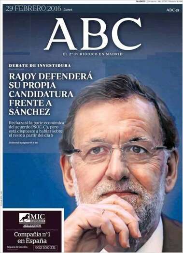 ABC: "Debate de investidura: Rajoy defenderá su propia candidatura frente a Sánchez. Rechazará la parte económica del acuerdo PSOE-C's, pero está dispuesto a hablar sobre el resto a partir del día 5".