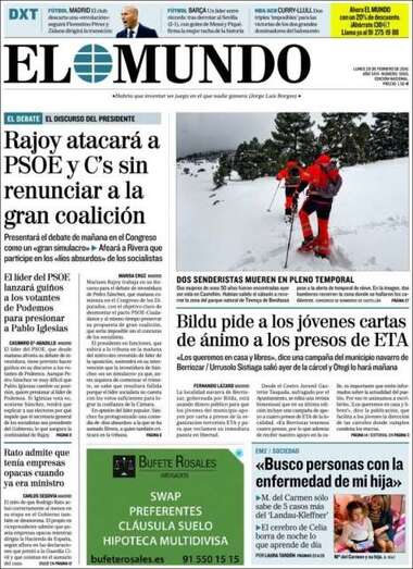 El Mundo: "Rajoy atacará a PSOE y C's sin renunciar a la gran coalición: presentará el debate como un "gran simulacro"; "El líder del PSOE lanzará guiños a los votantes de Podemos para presionar a Iglesias"; "Bildu pide a los jóvenes cartas de ánimo a los presos de ETA: Urrusolo Sistiaga salió ayer de la cárcel y Otegi lo hará mañana"; "Rato admite que tenía empresa opacas cuando ya era ministro".