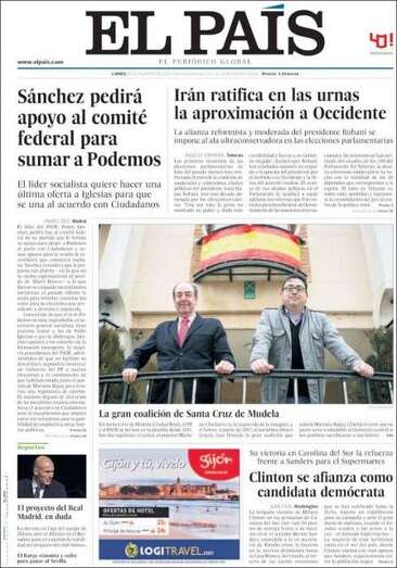 El País: "Sánchez pedirá apoyo al comité federal para sumar a Podemos: El líder socialista quiere hacer una última oferta a Iglesias para que se una al acuerdo con Ciudadanos"; "Irán ratifica en las urnas la aproximación a Occidente"; "Clinton se afianza como candidata demócrata: Su victoria en Carolina del Sur la refuerza frente a Sanders para el Supermartes"; "La gran coalición de Santa Cruz de Mudela (Ciudad Real): el PP y el PSOE se turnan en la alcaldía desde 2011".