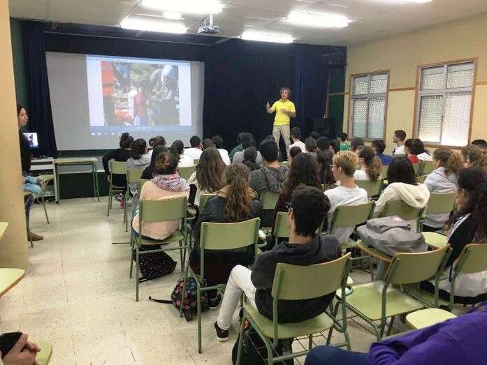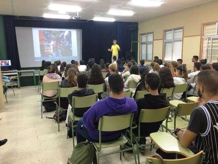 Esmoris, uno de los voluntarios de la ONG Proactiva Open Arms en Lesbos, disertó su experiencia personal en Lesbos con la ayuda de la ayuda un vídeo para acercar esta realidad a tres cursos con más de 100 estudiantes que asistieron al acto, al que acudieron los ediles Álvaro Monzón, de Playas, y Marta Hernández, de Solidaridad.