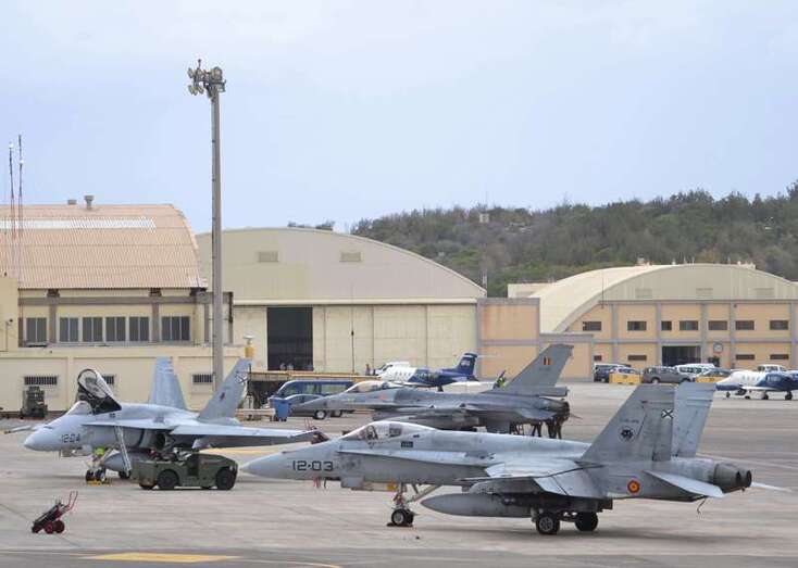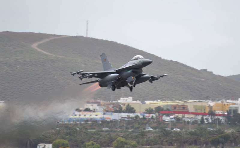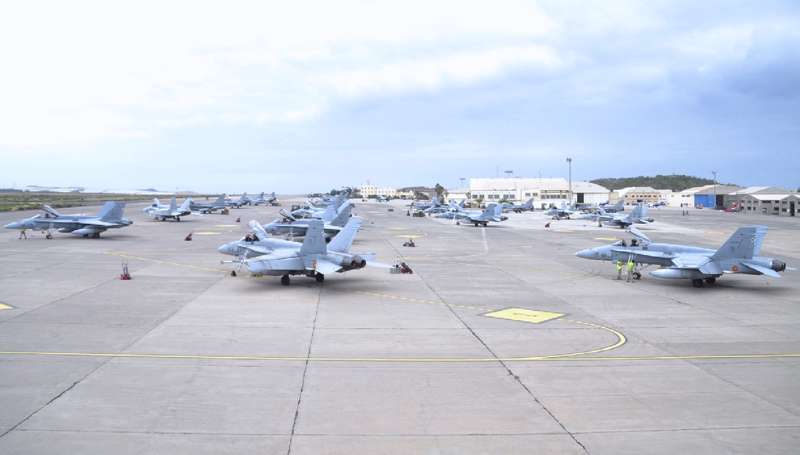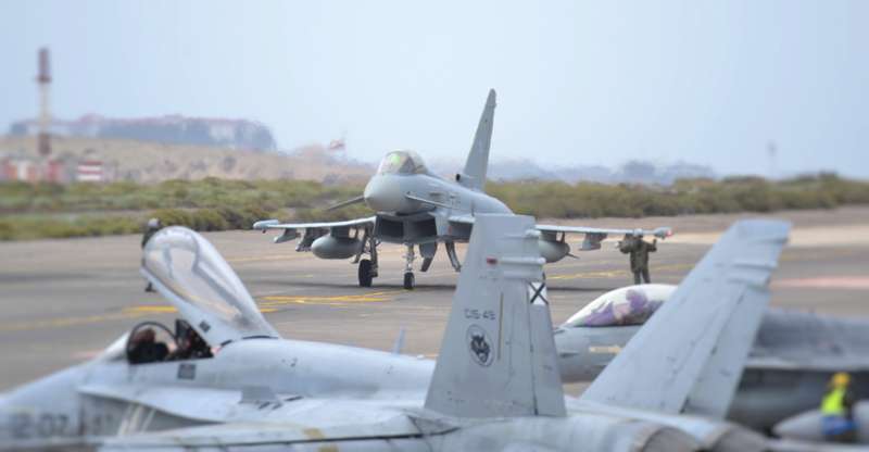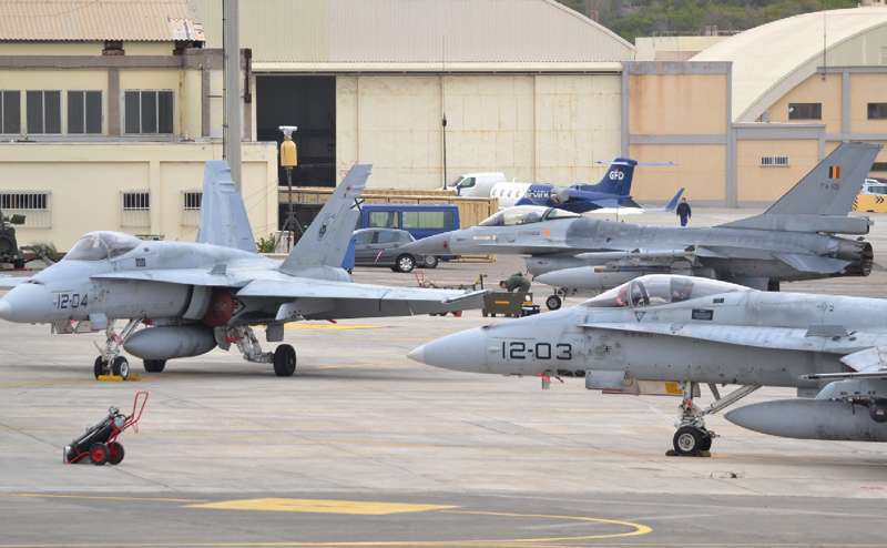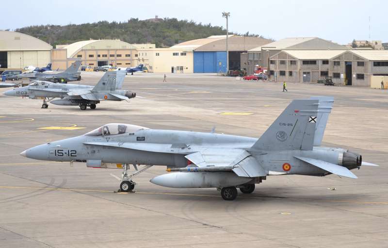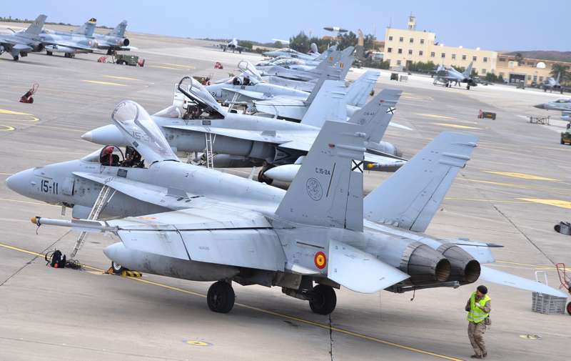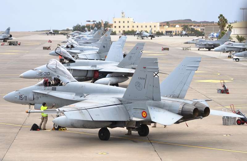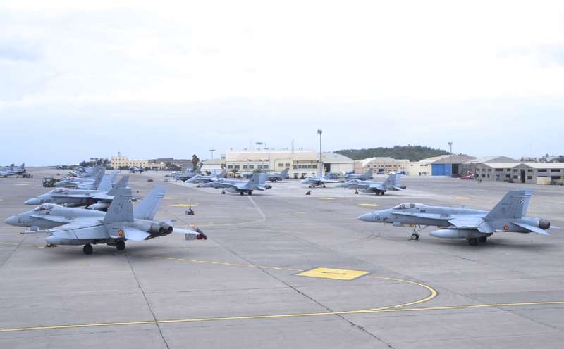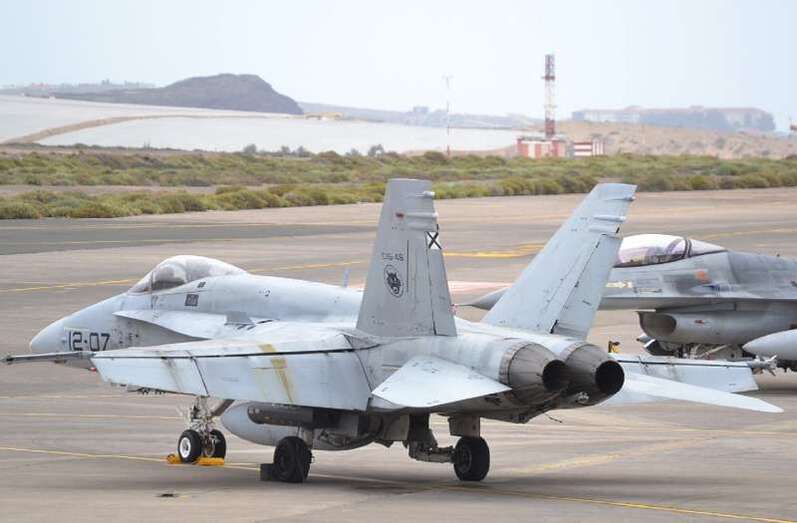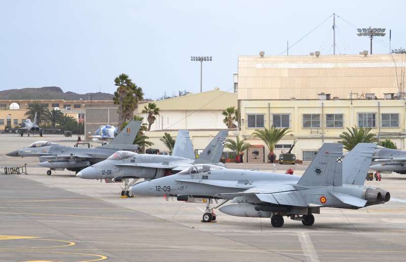 Cazas F-18 de las Alas 12, 15 y 46; Eurofighters de las Alas 11 y 14, Falcon 20 y Aviocar del Grupo 47; Hércules del Ala 31 y helicópteros Super Puma del 802 Escuadrón del Ejército del Aire (SAR); AV-8B Harrier de la Armada; Mirage 2000 de las Fuerzas Aéreas Francesas; Eurofighter, A-4 Skyhawk y Learjet de la Luftwaffe alemana, F-16 de Ejécito belga y un portentoso y característico Boeing E3-A AWACS de la OTAN, uno de los más esperados, son las aeronaves que estos días se pueden ver sobrevolando a velocidades de vértigo los cielos del Archipiélago.