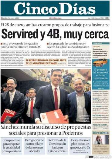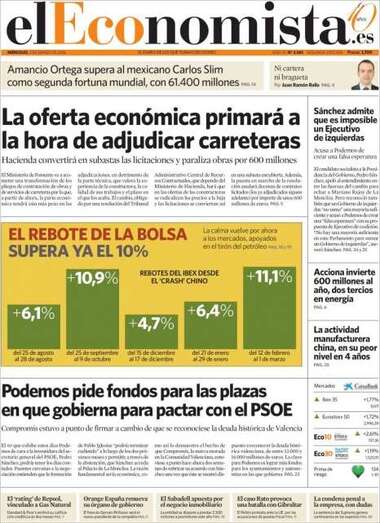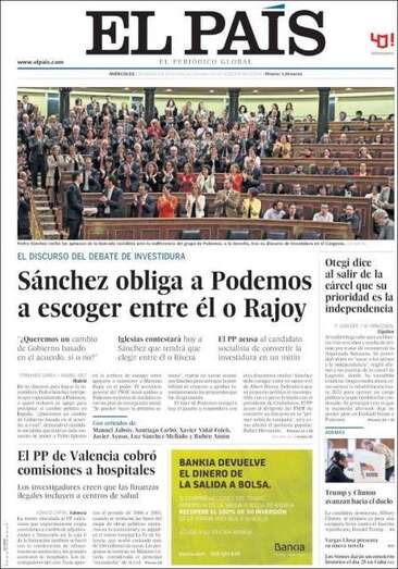 El País: "Sánchez obliga a Podemos a escoger entre él o Rajoy. Iglesias contestará hoy a Sánchez que tendrá que elegir entre él o Rivera"; "Otegi dice al salir de la cárcel que su prioridad es la independencia"; "El PP de Valencia cobró comisiones a hospitales. Los investigadores creen que las finanzas ilegales incluyen a centros de salud".