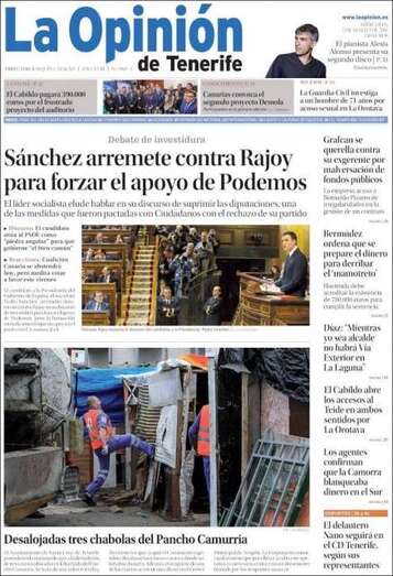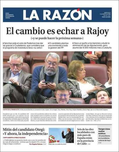 La Razón: "El cambio es echar a Rajoy ("y se puede hacer la próxima semana")"; "Mitin del candidato Otegi: "Y ahora, la independencia"; "Seis de las diez localidades con más paro de España están en la provincia de Cádiz"; "Vargas Llosa vuelve erótico: "El amarillismo es el problema cultural de hoy".