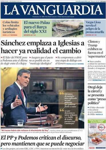 La Vanguardia: "Sánchez emplaza a Iglesias a hacer ya realidad el cambio. "Mi fracaso habría sido rechazar el ofrecimiento del Rey". El PP y Podemos critican el discurso, pero mantienen que se puede negociar"; "Clinton y Trump exhiben su fuerza en el 'supermartes'"; "Otegi deja la cárcel y se presenta como "preso político"".