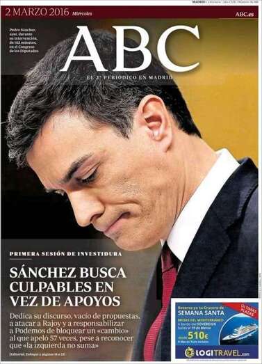 ABC: "Primera sesión de investidura: Sánchez busca culpables en vez de apoyos. Dedica su discurso, vacío de propuestas, a atacar a Rajoy y a responsabilizar a Podemos de bloquear un 'cambio' al que apeló 57 veces, pese a reconocer que "la izquierda no suma".