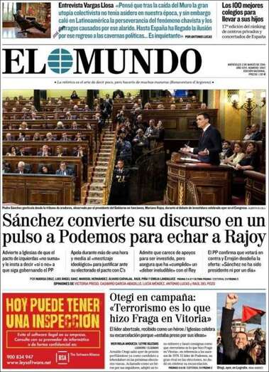 El Mundo: "Sánchez convierte su discurso en un pulso a Podemos para echar a Rajoy"; "Otegi en campaña: "Terrorismo es lo que hizo Fraga en Vitoria"; "Entrevista a Vargas Llosa: "Pensé que tras la caída del Muro la gran utopía colectivista no tenía asidero en nuestra época".