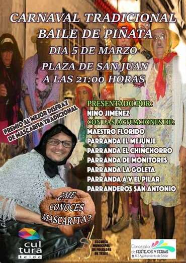 Tras el pregón, a las 21.00 horas, se celebrará el Baile de Piñata, organizado entre las concejalías de Festejos y Cultura, a través de la Escuela Municipal de Folclore de Telde, con el lema ‘¿Me conoces mascarita?’.