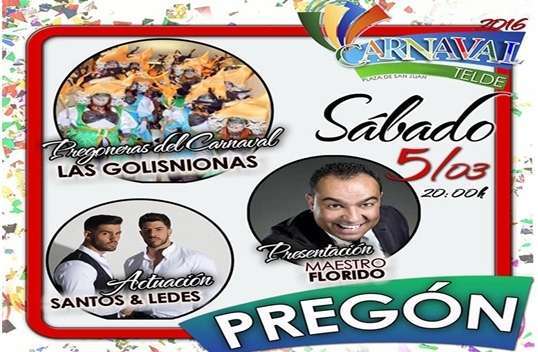 Telde.- El Carnaval Tradicional de Telde comienza este sábado con el pregón de la murga Las Golisnionas y el Baile de Piñata en la plaza de San Juan, a partir de las 20.00 horas. Maestro Florido será el encargado de conducir este acto que inaugura las carnestelondas teldenses que se extenderán hasta el 13 de marzo.