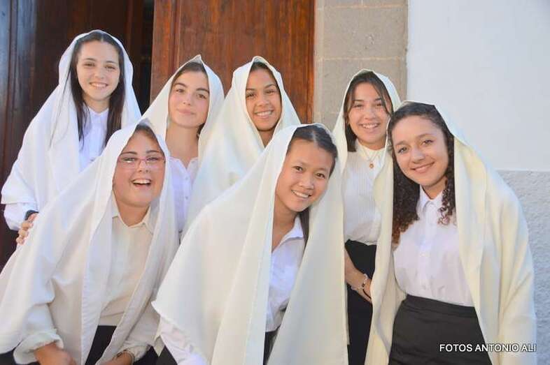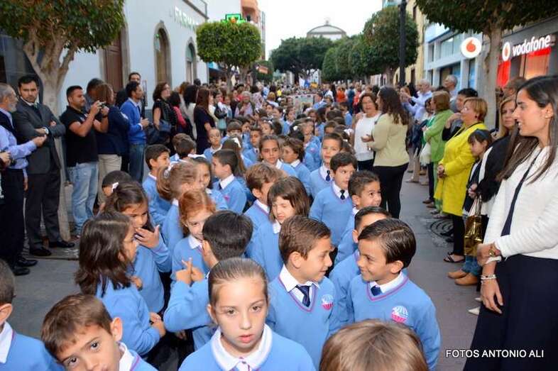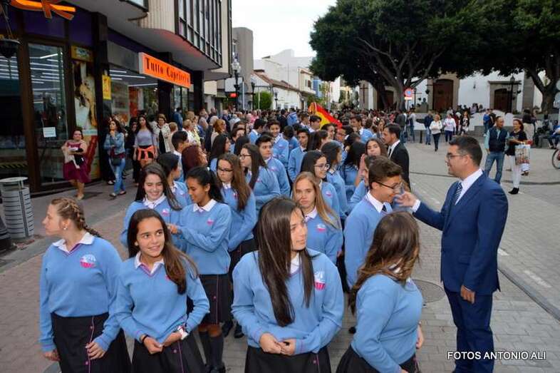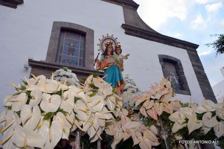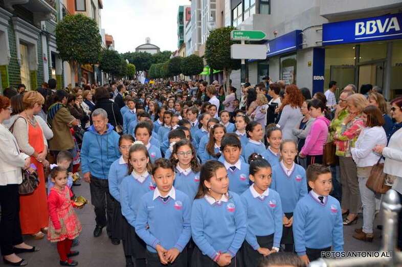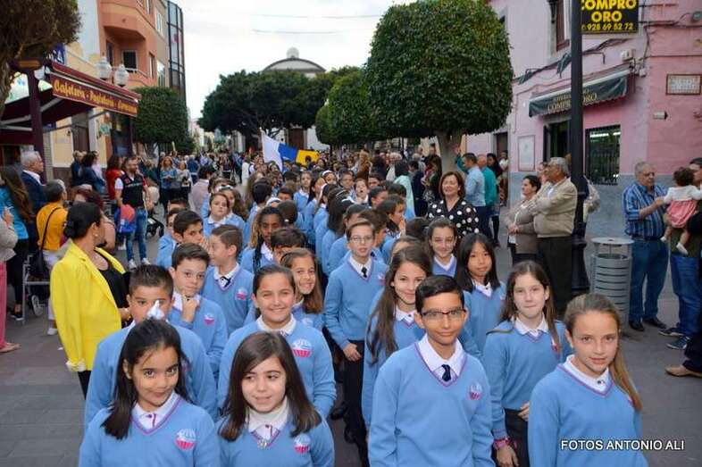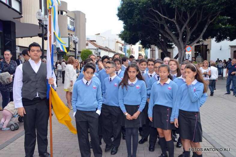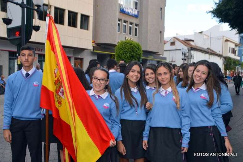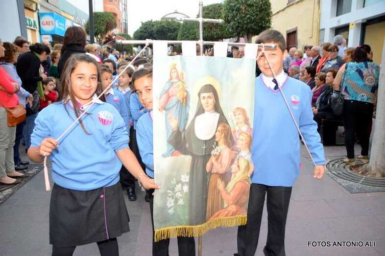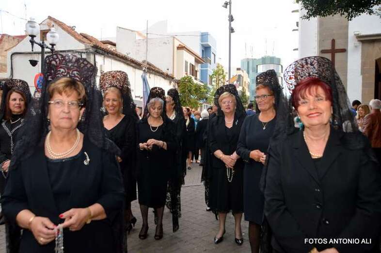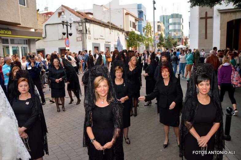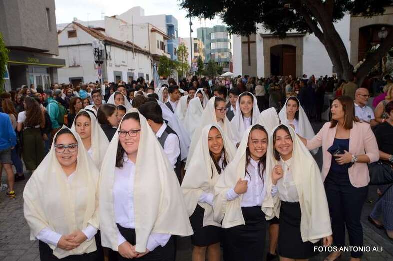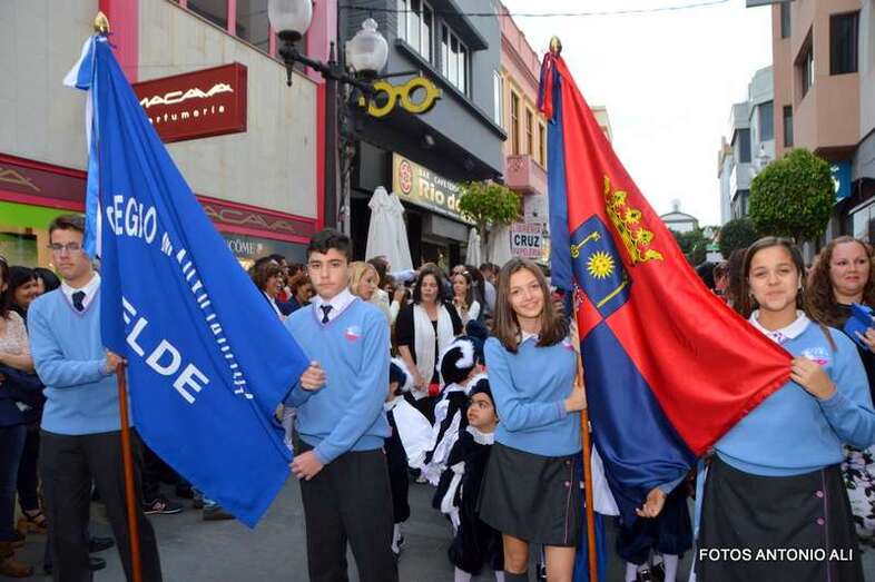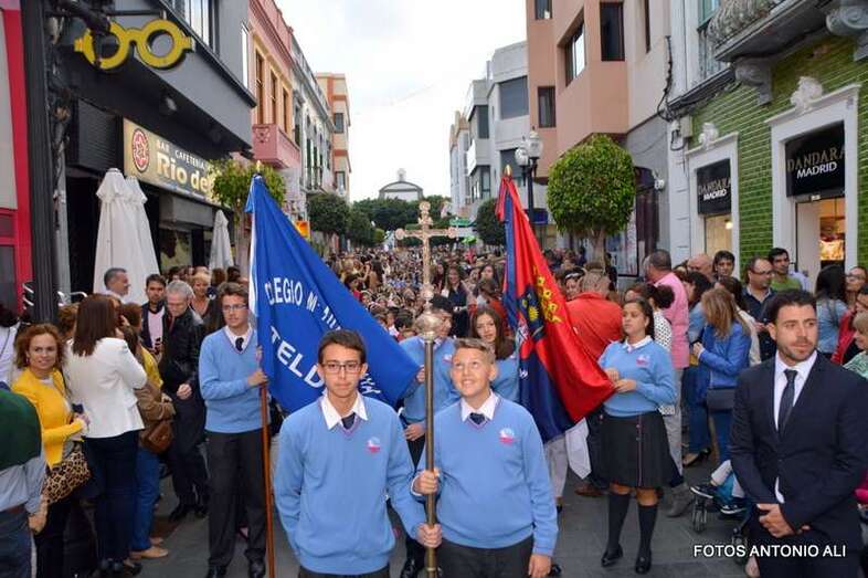 Con sus estandartes y banderas, la procesión religiosa que organiza anualmente la comunidad salesiana de Telde desde hace más de 60 años contó con el acompañamiento de cientos de devotos y alumnos del colegio, además de un grupo de numerosas antiguas alumnas que portaban mantillas de varias generaciones. La representación municipal estuvo encabezada por la alcaldesa Carmen Hernández e integrada por varios ediles. La Banda Municipal puso la música a la comitiva religiosa