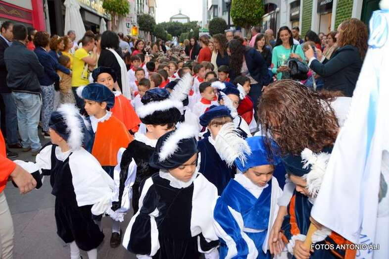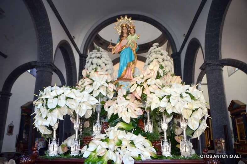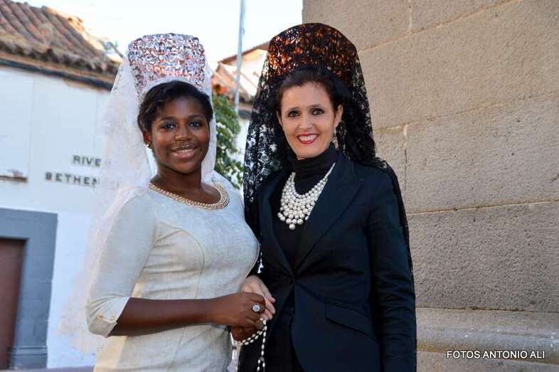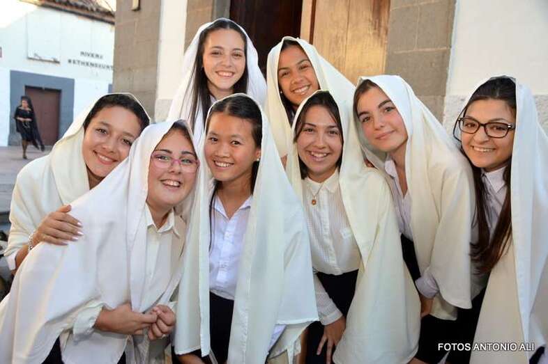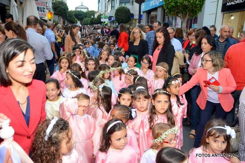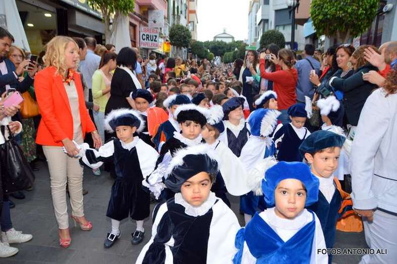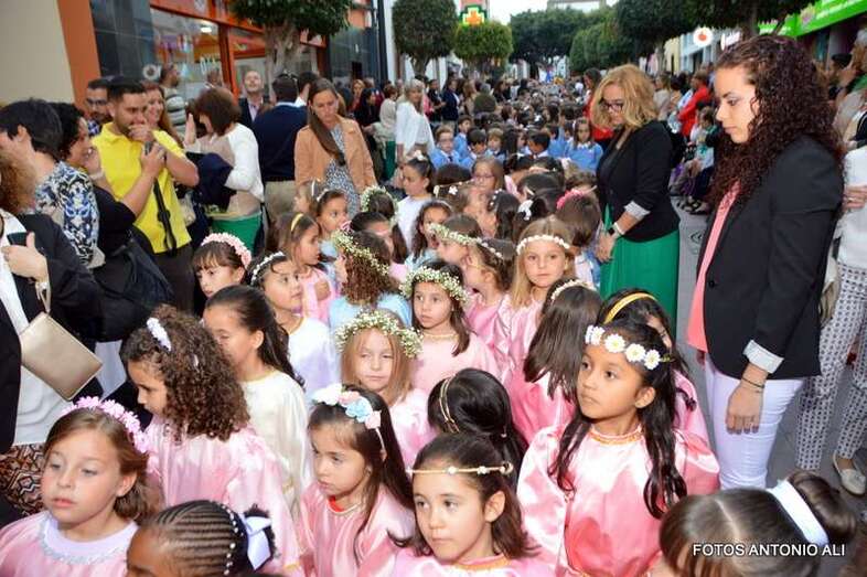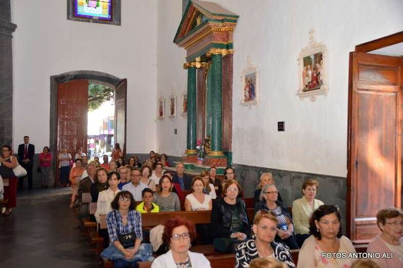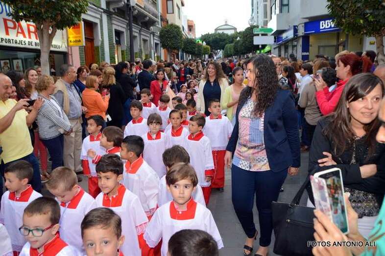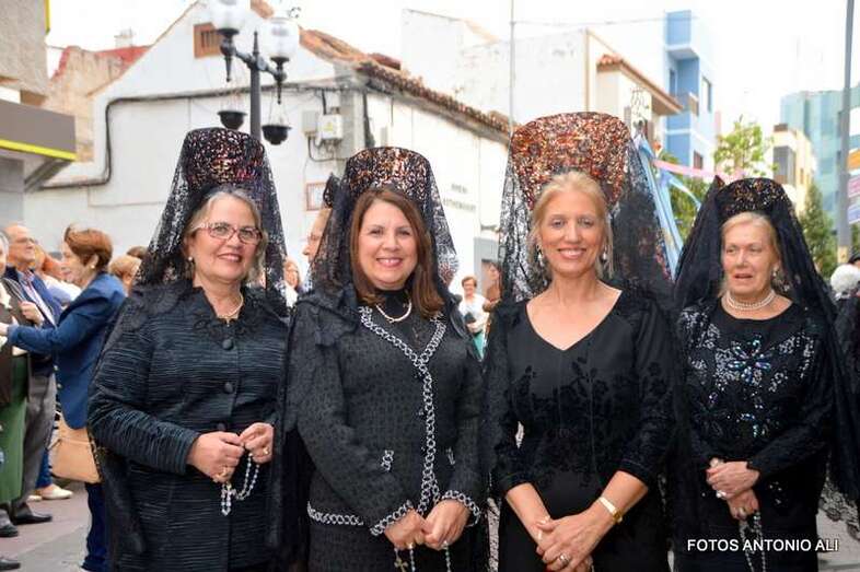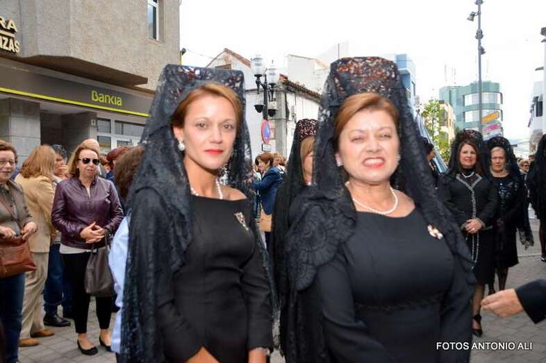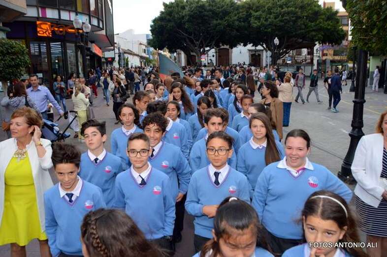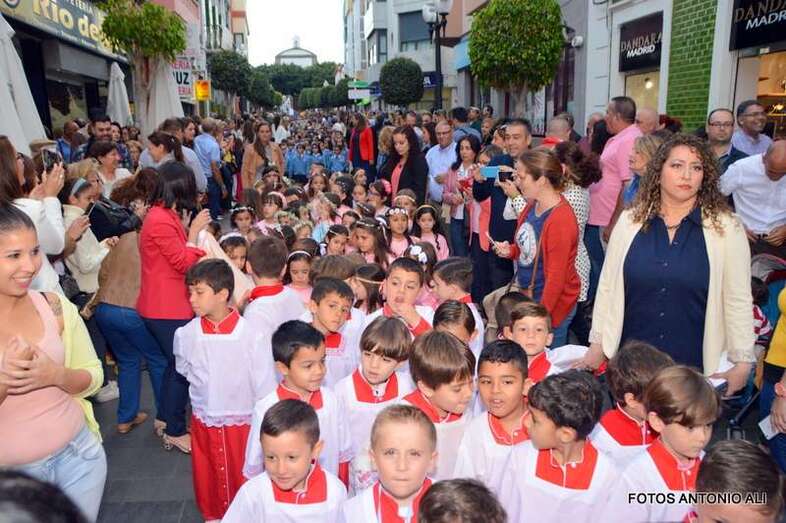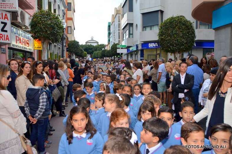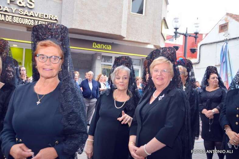Con sus estandartes y banderas, la procesión religiosa que organiza anualmente la comunidad salesiana de Telde desde hace más de 60 años contó con el acompañamiento de cientos de devotos y alumnos del colegio, además de un grupo de numerosas antiguas alumnas que portaban mantillas de varias generaciones. La representación municipal estuvo encabezada por la alcaldesa Carmen Hernández e integrada por varios ediles. La Banda Municipal puso la música a la comitiva religiosa