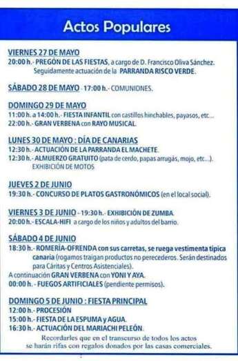 Las fiestas se prolongarán hasta el 5 de junio, jornada principal en la que se celebrarán la procesión, la fiesta de la espuma y agua y actuación del mariachi Peleón.