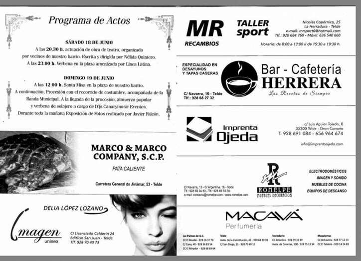 El sábado 18 de junio está previsto una obra de teatro (20.30 horas) dirigida y escrita por Nélida Quintero y representada por los vecinos del barrio y una verbena (23.00 horas) amenizada por Línea Latina. El domingo 19 será el día grande de las fiestas. A las 12.00 se oficiará una eucaristía en la plaza pública para, posteriormente, dar comienzo a la tradicional procesión con la imagen del santo por las calles del barrio.