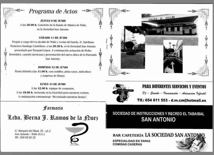 Finalmente no quiero despedirme sin hacer una breve mención a la Sociedad El Tabaibal de San Antonio, de la cual soy socio desde que vine a vivir aquí hasta el momento actual, y de la que me siento muy orgulloso por la labor social que siempre ha llevado a cabo, dinamizando al barrio y haciendo que el mismo sea un referente para la ciudad de Telde.