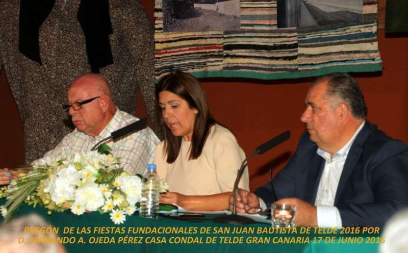 El acto iniciado por la Alcaldesa de la Ciudad de Telde doña Carmen Rosa Hernández Jorge que acompañada en la mesa de presentación por Juan Francisco Martel Santana, Concejal de Festejos y Ferias, abre la intervención exponiendo el saludo y bienvenida a este pregón y fiestas de San Juan Bautista de Telde glosa la figura y curriculum de Pregonero 2016 y expone entre una de sus reflexiones: “……Las fiestas populares son una oportunidad única que tenemos los vecinos y vecinas para relacionarnos en un ambiente distendido y relajado, lejos de las preocupaciones diarias, para estrechar lazos y cohesionar el espíritu de comunidad imprescindible para crecer como sociedad. Telde es una gran ciudad, y sus hombres y mujeres, tanto en las adversidades como en las fiestas, debemos hacer piña y arrimar el hombro contra aquello que detestamos y a favor de reforzar nuestra identidad en cada ocasión que podamos. Sintámonos orgullosos de ser teldenses porque tenemos motivos de sobra para que así sea. Esta es la segunda oportunidad que tengo como alcaldesa de presentar al encargado de iniciar oficialmente las fiestas de este barrio en torno al que se desarrolló nuestra ciudad. Ya lo hice el año pasado cuando fue la Banda Municipal de Telde y hoy tengo el gran honor de introducir a una persona a la que profeso un cariño especial”.