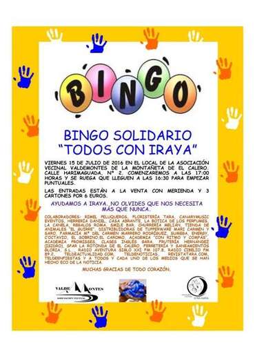 Así es que, a razón de todo esto, hemos pensado en llevar a cabo, un bingo solidario y una Gala “Todos con Iraya” en La Montañeta de El Calero, C/ Harimaguada, nº 18, el próximo mes de julio de 2016. (El bingo el viernes 15 de julio y la Gala el sábado 30 de julio)