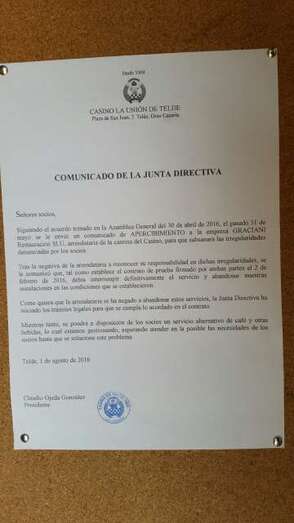 Telde.- El Casino de Telde vuelve a tener problema con el funcionamiento de su cantina. La junta directiva que preside Claudio Ojeda ha iniciado los trámites legales para rescindir el contrato de prueba a la empresa Graciani Restauración SLU ante su negativa a subsanar las “irregularidades denunciadas por los socios”. TA ofrece el comunicado.