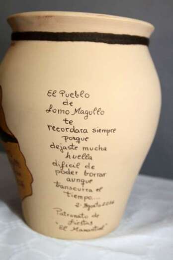 Finalizadas las intervenciones desde la mesa de presentación, el Patronato de Fiestas El Manantial hizo entrega de un obsequio recuerdo en memoria del insigne periodista a su hija Gara, recibido conjuntamente por Nieves Suárez, viuda del recordado Adolfo e hijo Juan Santana. Una leyenda sobre el cántaro expresa: “El pueblo de Lomo Magullo te recordará siempre porque dejaste mucha huella difícil de poder borrar aunque transcurra el tiempo…….2 de agosto de 2016.Patronato de Fiestas El Manantial”.