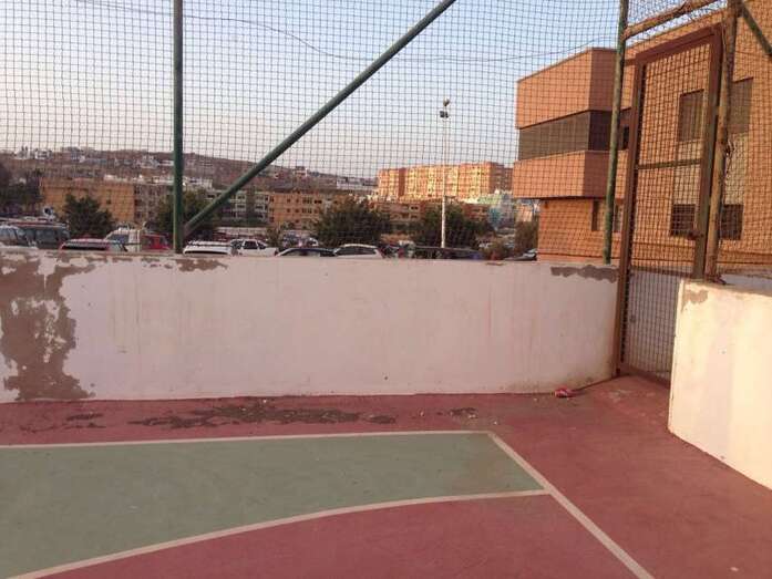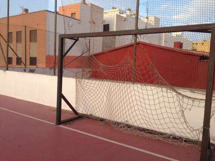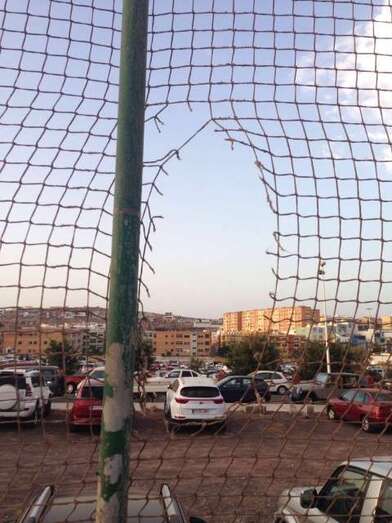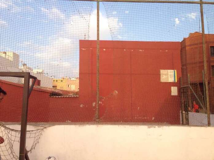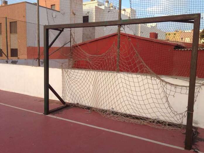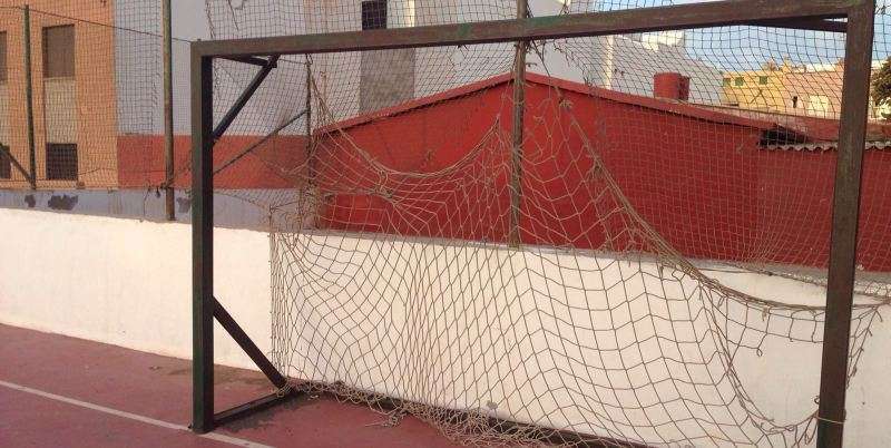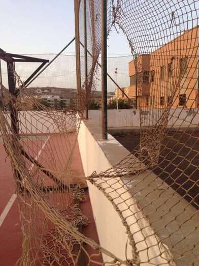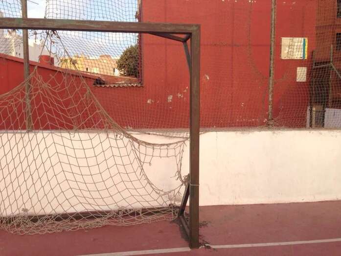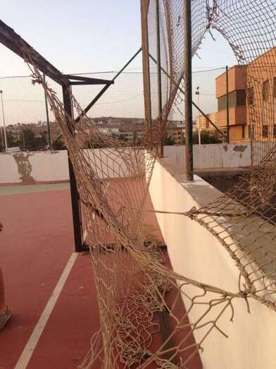 Telde.- Cancha de Clavellinas. Decenas de niños pasan por allí a diario a jugar al fútbol y los menores se lo piensan mucho de chutar a gol en la puerta que está al naciente porque la valla metálica protectora del recinto y la red de la portería presentan agujeros de gran tamaño por donde se cuela con mucha frecuencia la pelota.
