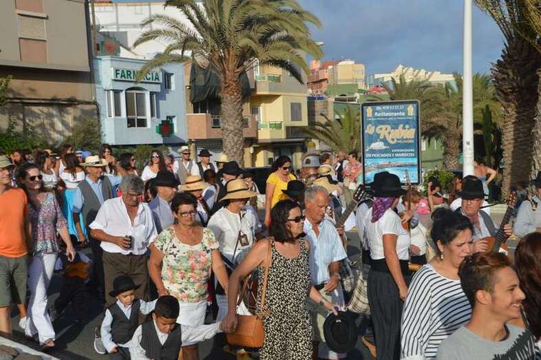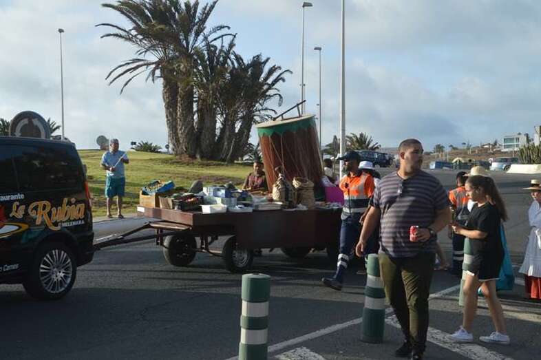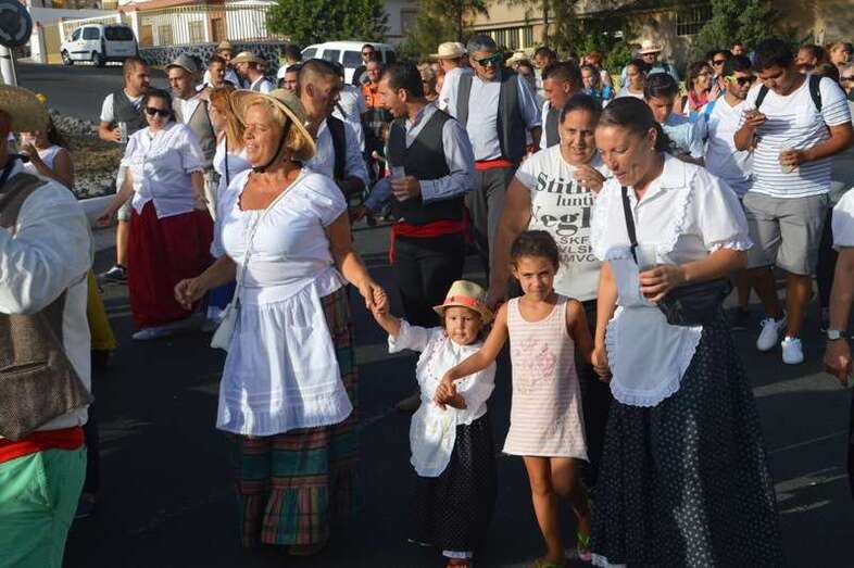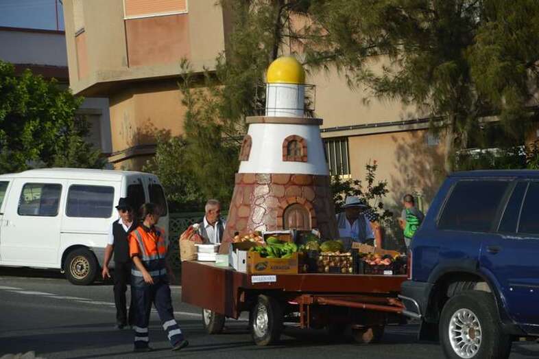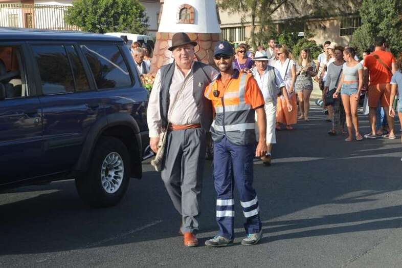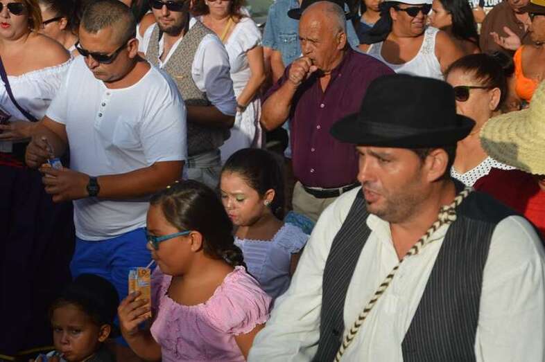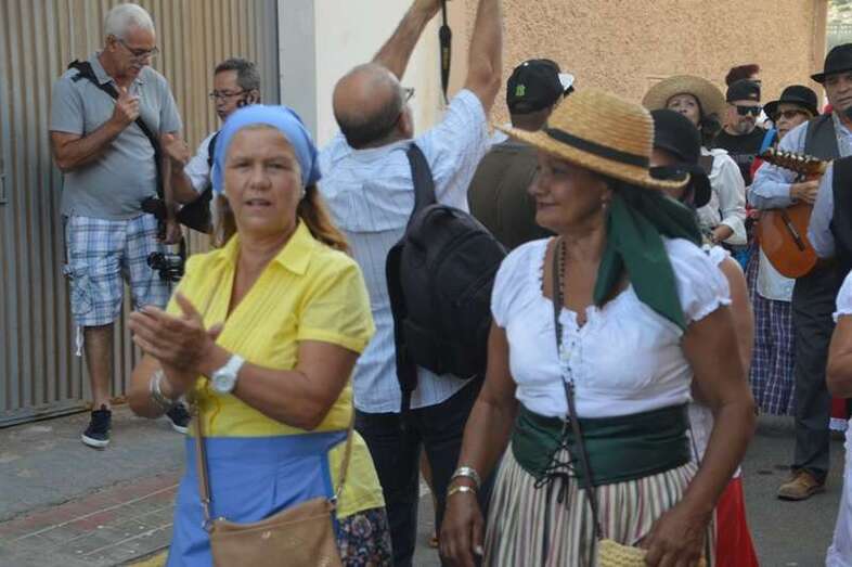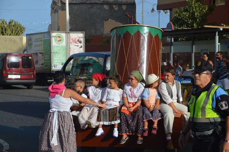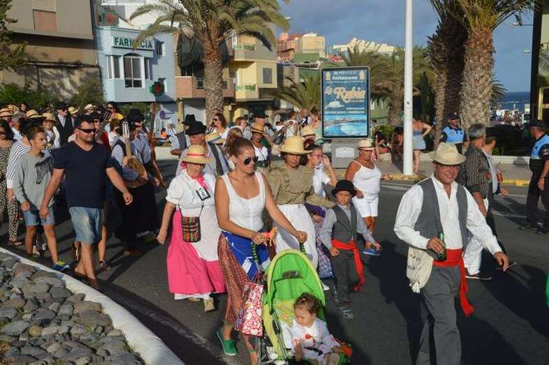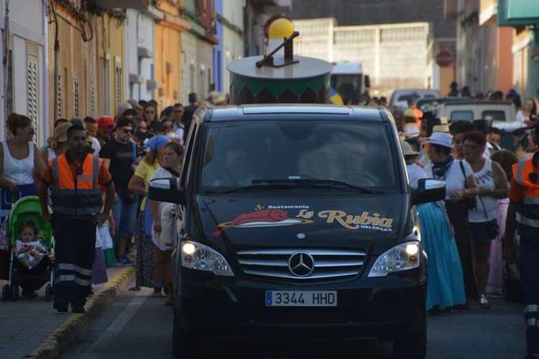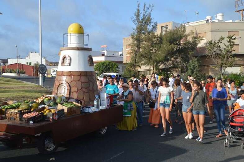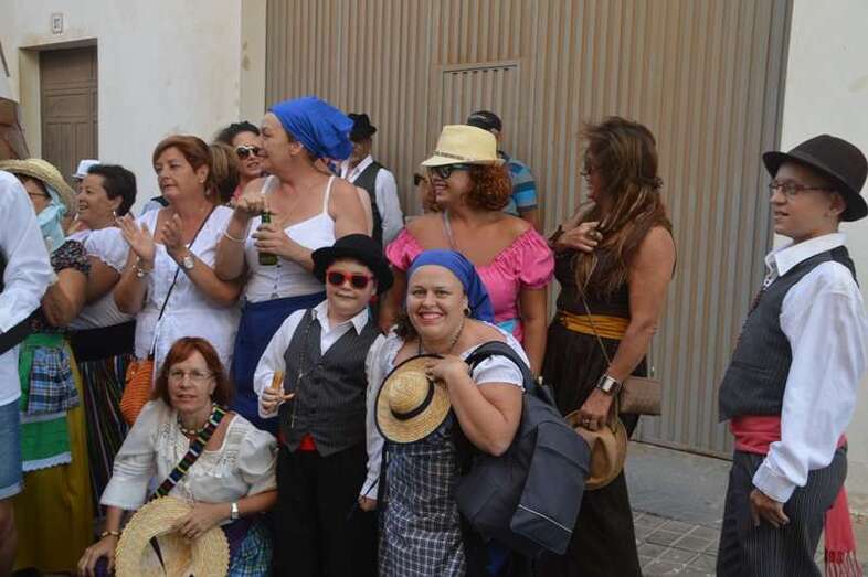 El desfile popular se puso en marcha a las 18.45 horas en el campo de fútbol y finalizaría hora y media después en la plaza de Clavellinas, donde se llevaríá a efecto la ofrenda a los patronos con productos de la tierra y un baile de cuerdas. Este año se acortó un poco el periplo y así al llegar a la rotonda que regula el tráfico de las calles de Américo Vespucio y La Niña, a la altura de Salinetas, la comitiva enfiló por esta última vía en dirección hacia el templo de Clavellinas