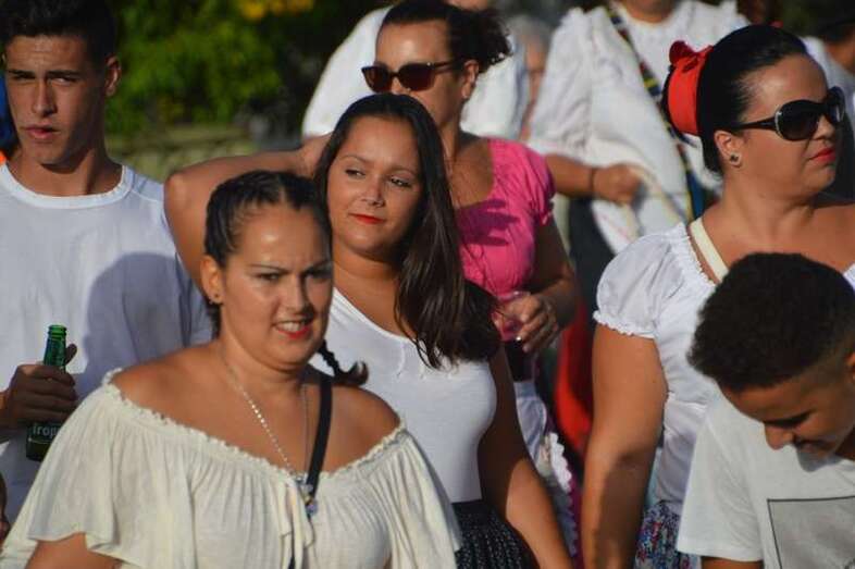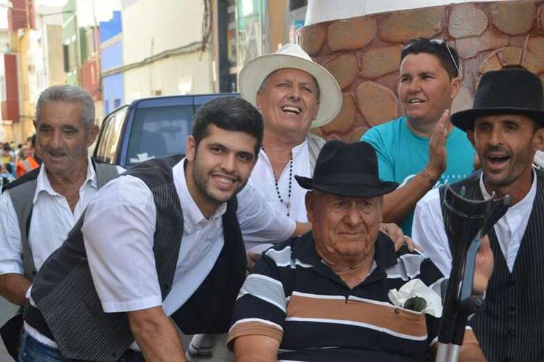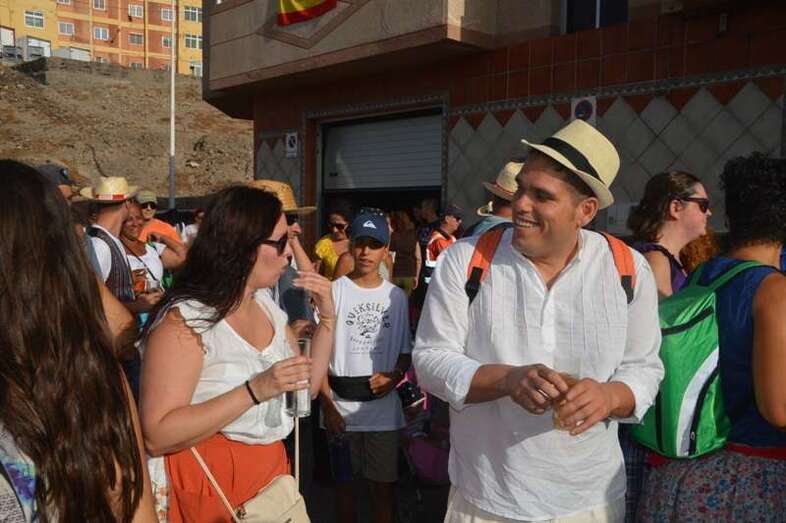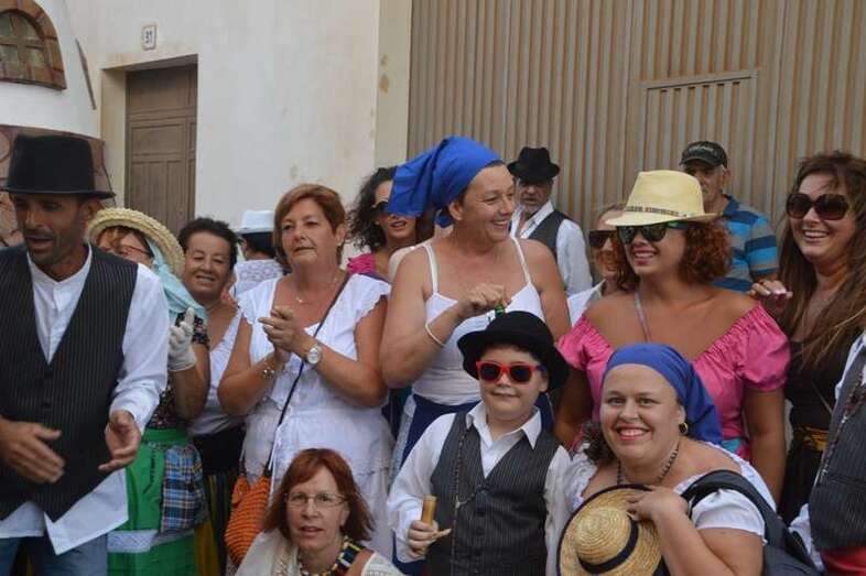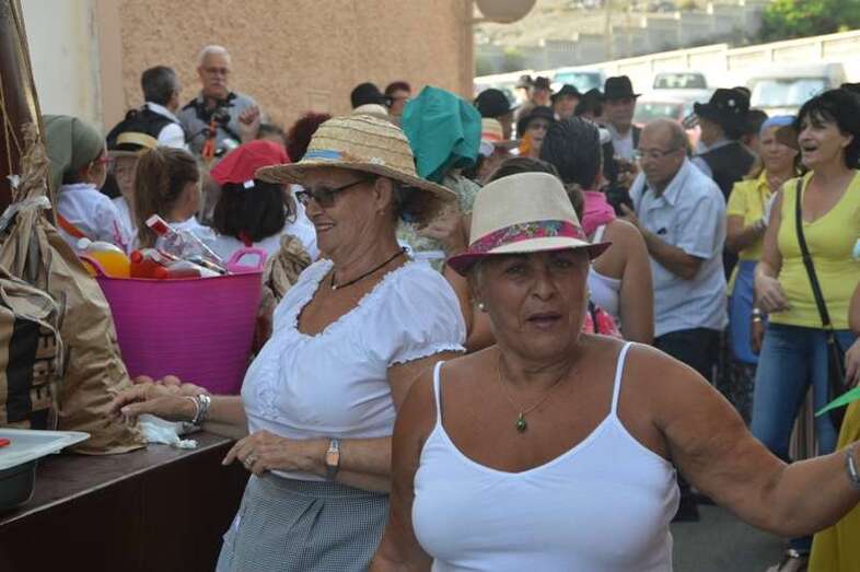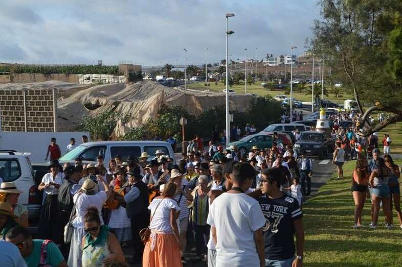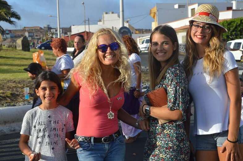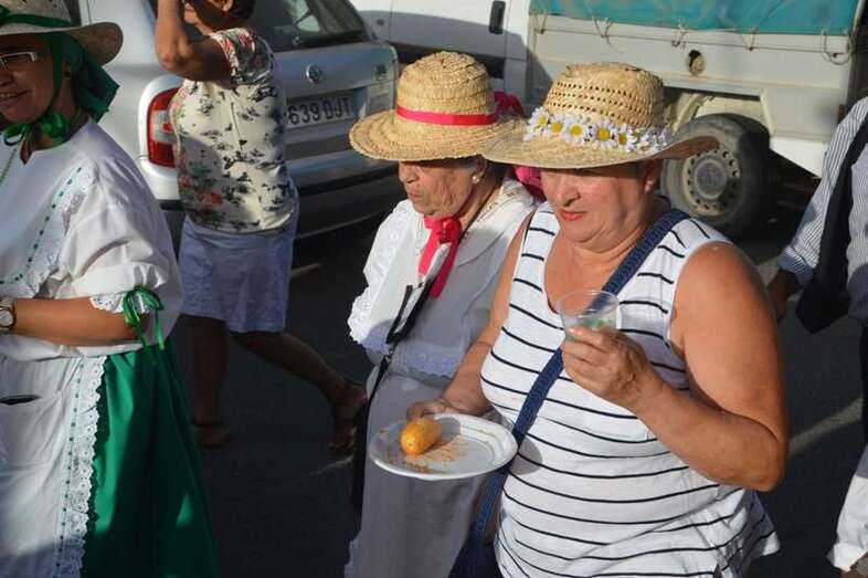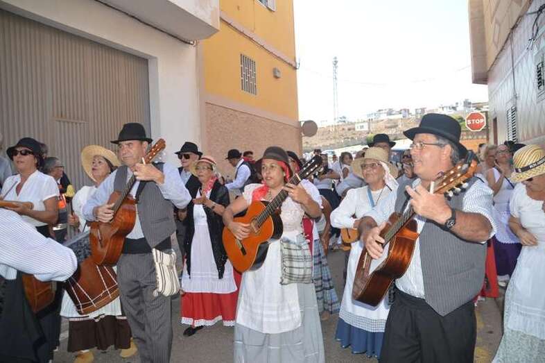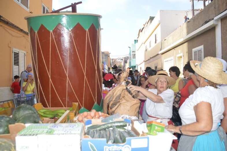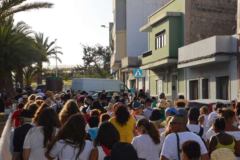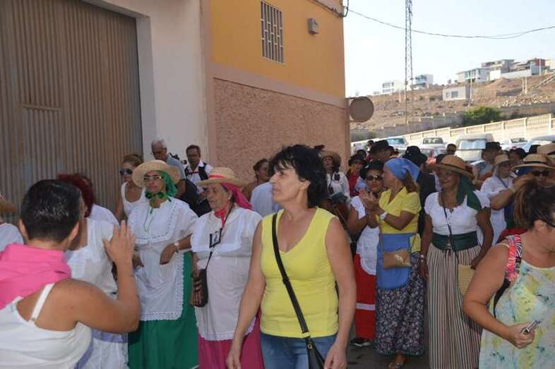El desfile popular se puso en marcha a las 18.45 horas en el campo de fútbol y finalizaría hora y media después en la plaza de Clavellinas, donde se llevaríá a efecto la ofrenda a los patronos con productos de la tierra y un baile de cuerdas. Este año se acortó un poco el periplo y así al llegar a la rotonda que regula el tráfico de las calles de Américo Vespucio y La Niña, a la altura de Salinetas, la comitiva enfiló por esta última vía en dirección hacia el templo de Clavellinas