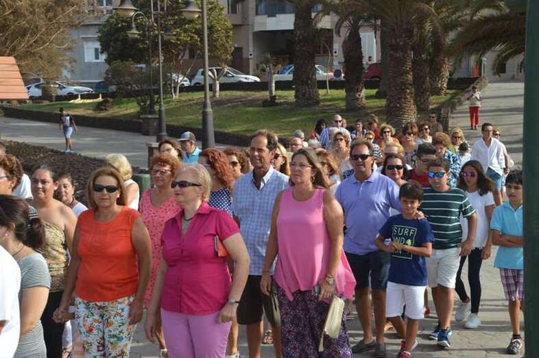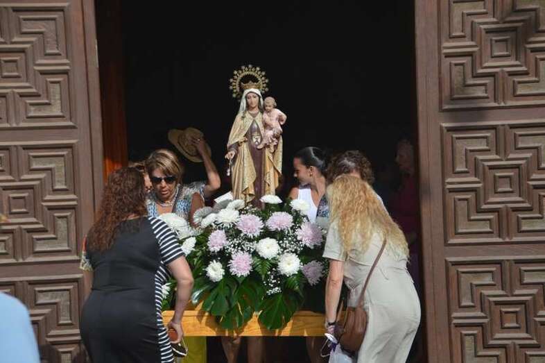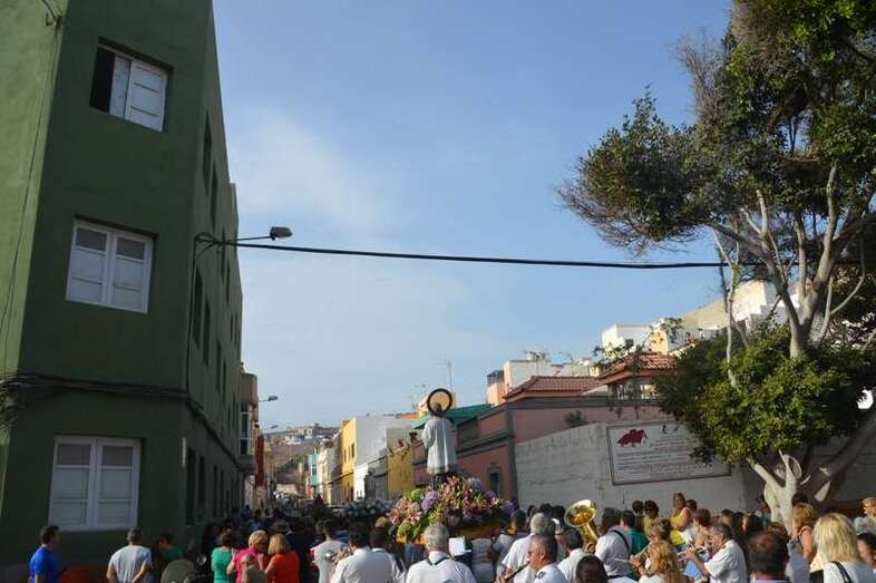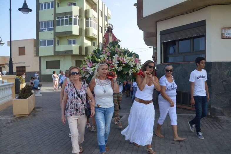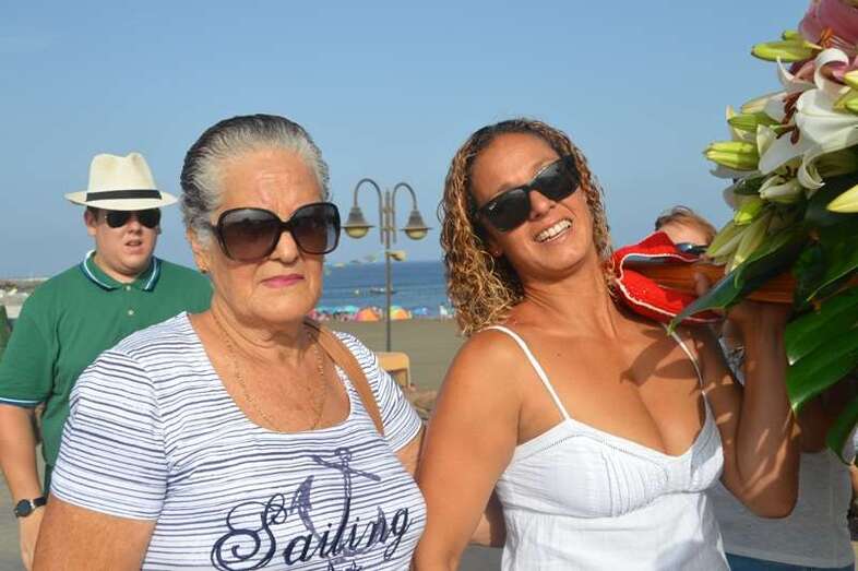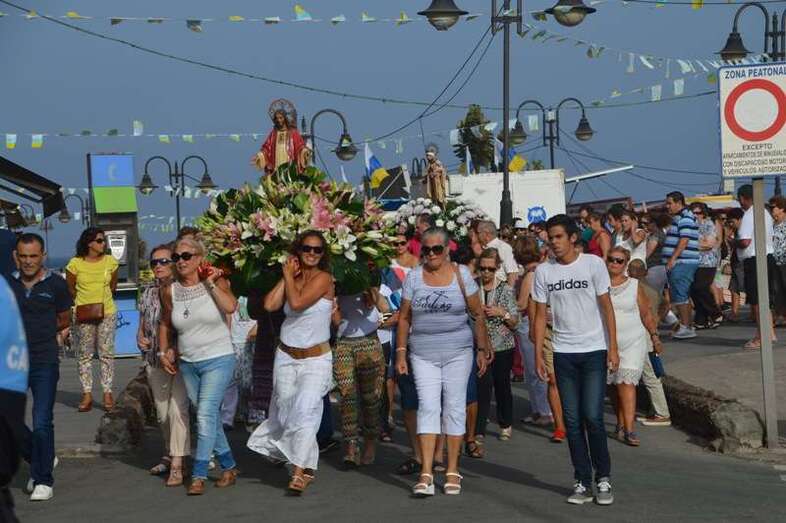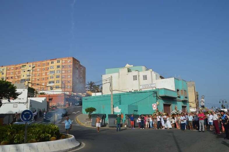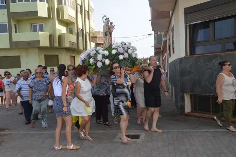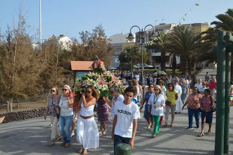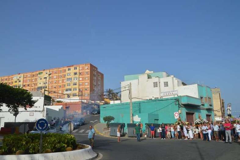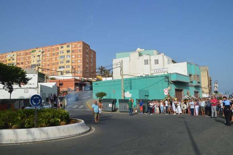 Después de un recorrido por la avenida de Melenara, la procesión enfilo el sector viejo de esta playa donde fue saludada por varias descargas de voladores y los vivas del público. Poco a poco, las imágenes se fueron acercando hasta la arena de la playa, en donde les esperaban las tres embarcaciones de pescadores que las pasearían por el litoral de Melenara, Taliarte, Claveillas y Salinetas.