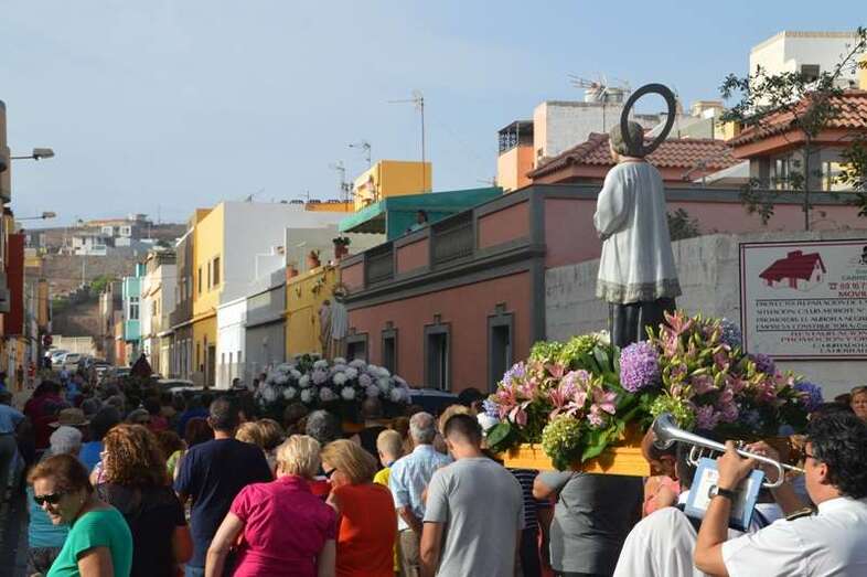 El desfile religioso se inició con los tronos portados a hombro por hombres y mujeres de Melenara, que asomaron por la puerta principal del templo de Clavellinas pasadas las 18.00 horas. A la puerta de la iglesia, las imágenes eran recibidas por la feligresía y por el concejal de Festejos, Juan Martel, único representante en ese momento del Ayuntamiento aunque más tarde se sumaron a la procesión los ediles Agustín Arencibia y Juan Antonio Peña.