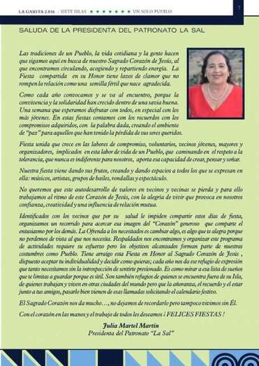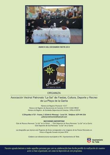 El Patronato de Fiestas La Sal ha comenzado a divulgar el programa de los actos populares y religiosos. El próximo viernes, Francisco Cabrera, a las 20.30 horas, dará el pistoletazo de salida con la lectura del pregón en el que pondrá voz a su hijo, el siempre recordado Jhonander Ojeda Alemán. Luego, tendrá lugar el izado de la bandera canaria a cargo de Alexis González Manzano y la actuación de grupo folclórico del Patronato La Sal.