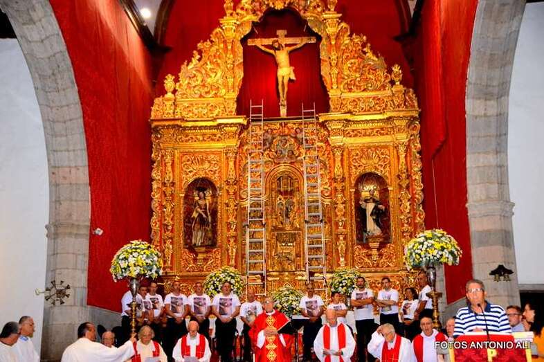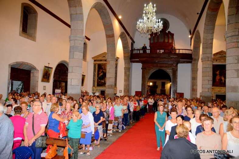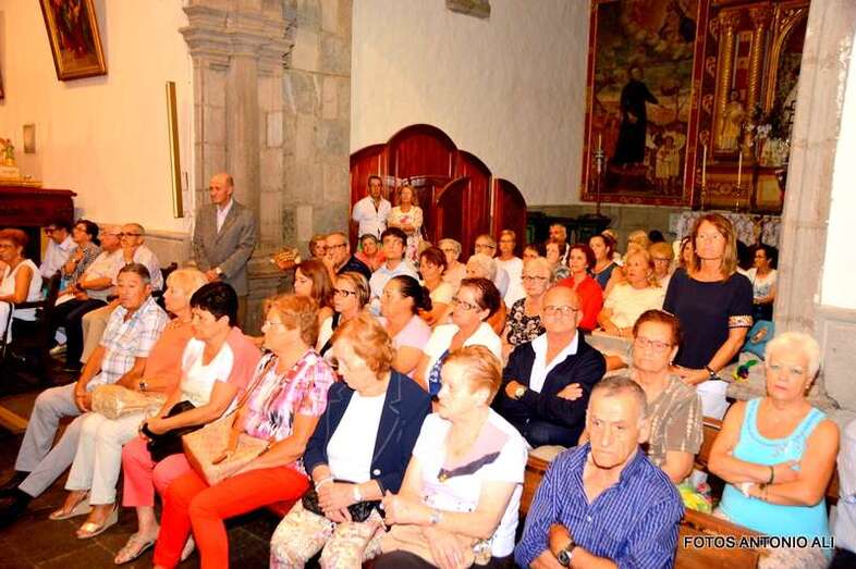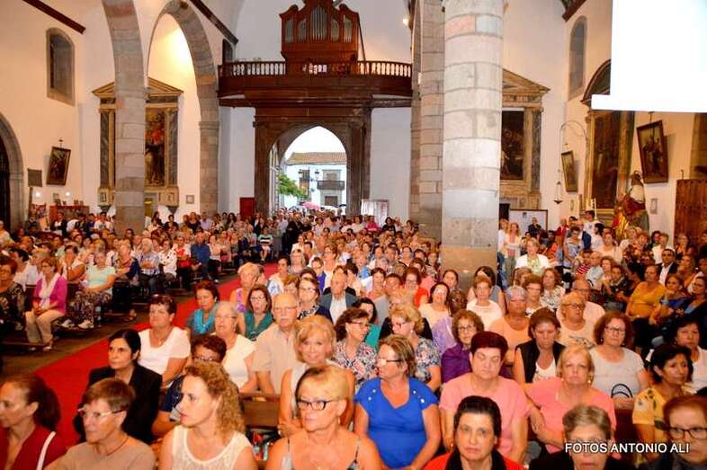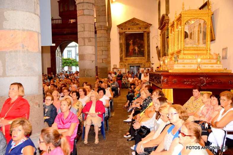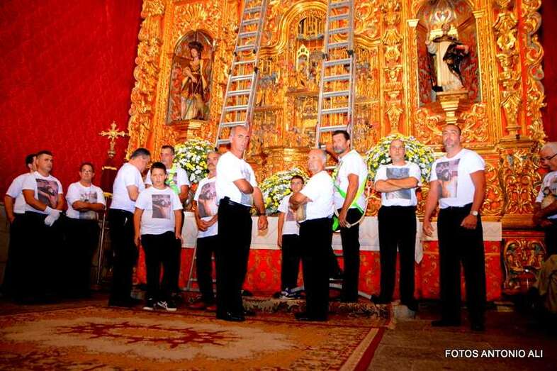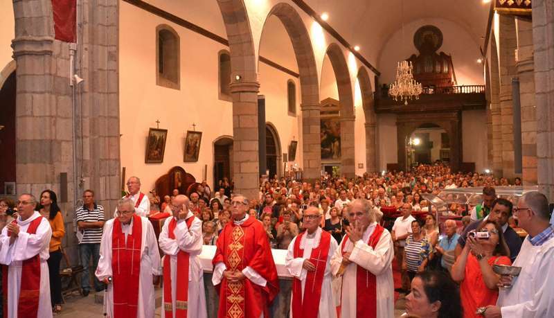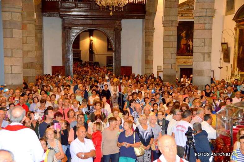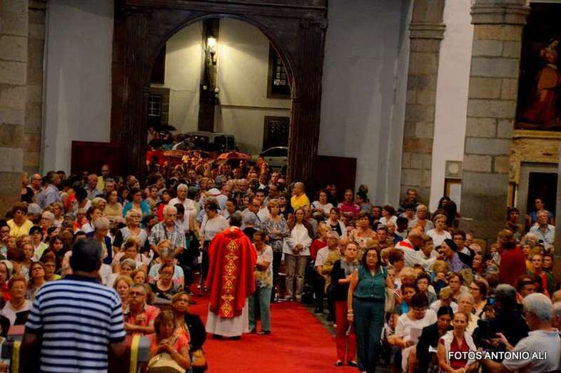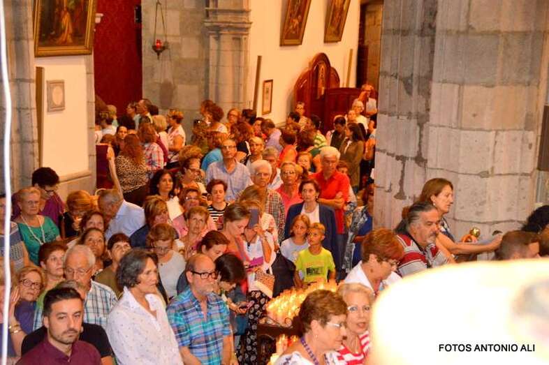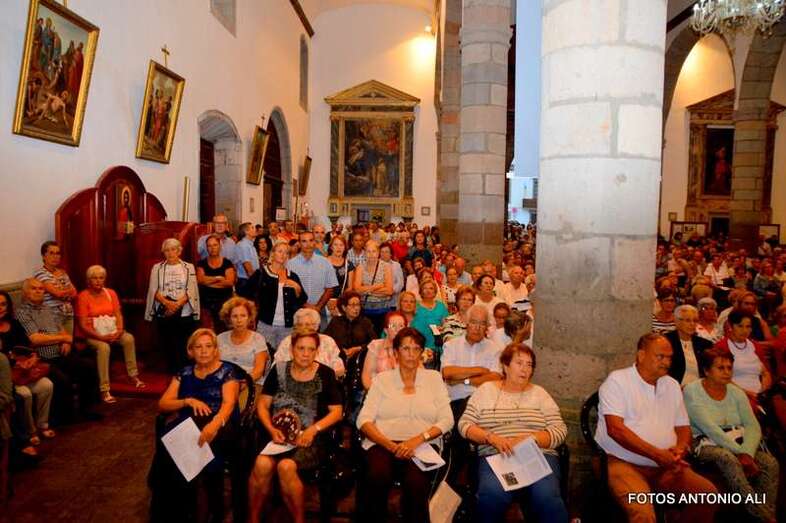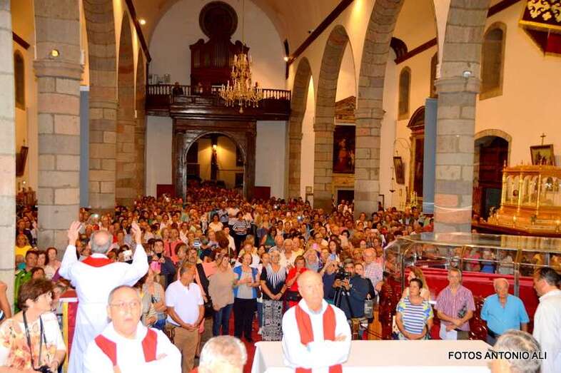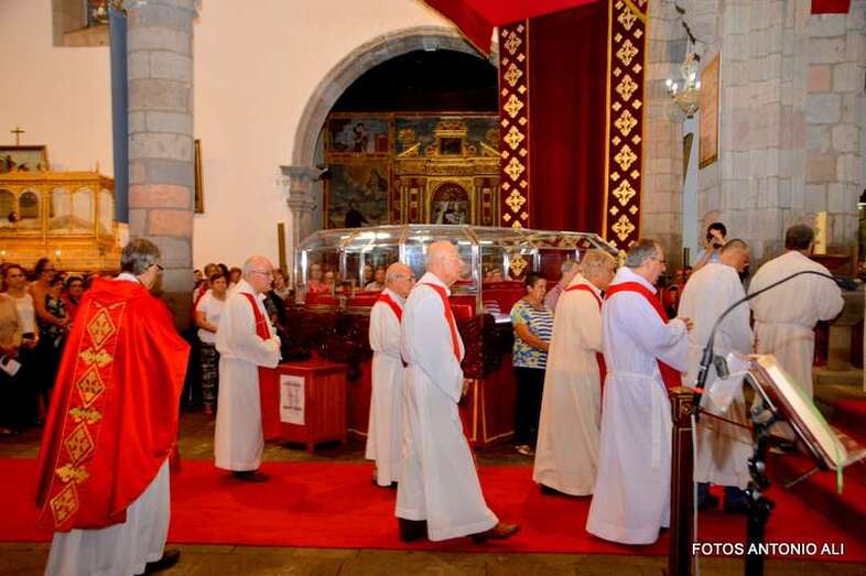 La bajada de la efigie, una tradición que se repite anualmente de manera ininterrumpidamente desde 1965, volvió a consumarse este tarde-noche a los pocos minutos de finalizar una eucaristía que presidió el reverendo Nicolás Monche López, canónigo de la Santa Iglesia Catedral de Santa Ana, junto a cerca de una decena de sacerdotes, entre ellos el párroco Jose María Cabrera y el que también fuera vicario y cura de esta Basílica, Francisco González.