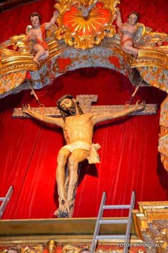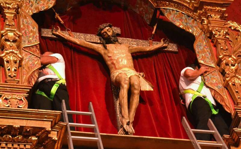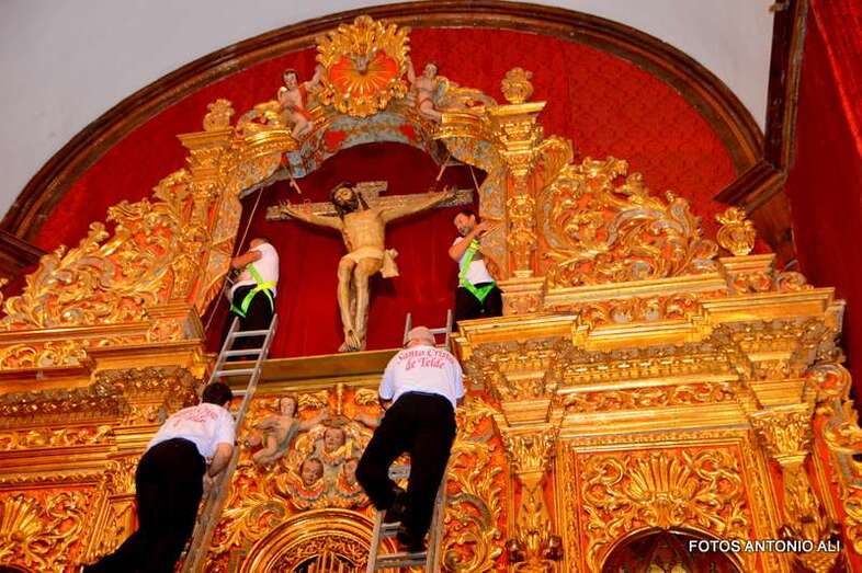 Telde.- El Santo Cristo de Telde se encuentra desde hace unos minutos arropado por sus fieles a los pies de la Basílica Menor de San Juan, después ser trasladado desde el altar mayor del templo matriz de la ciudad en una de las ceremonias de mayor arraigo e importancia de estas fiestas de carácter religioso que comenzaron ayer con el